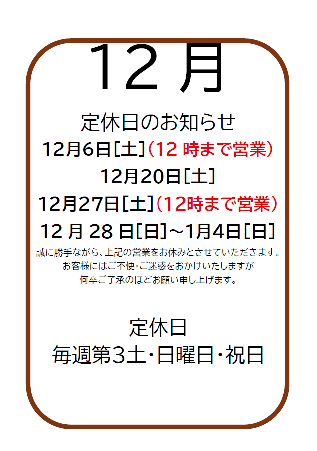 定休日のお知らせ(12月)